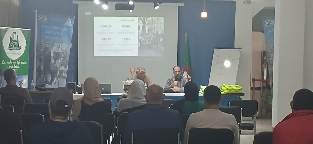 ثم مداخلة حول السلامة المروربة للاستاذ لعسكري محمد صالح واخيرا مداخلة حول دور الهيئات المحلية في تطوير هذه الثقافة حيث حث رئيس الجمعية على ضرورة مشاركة الجميع ؛ مديريات وهيئات وجمعيات ومجتمع مدني في تطوير ثقافة التنقل بالدراجة للعمل